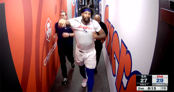 24直播网讯北京时间12月24日,NBA常规赛马刺客场大战76人,第二节场上出现争议判罚,庄神连吃两T被驱逐,纳斯怒喷裁判,之后裁判取消庄神的技犯,庄神又从更衣室中回到场上继续比赛;上半场最后阶段,恩比德怒喷裁判连吃两T被驱逐离场。