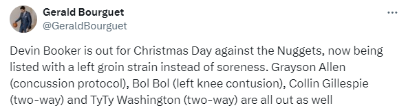 牛叉NBA录像网讯 北京时间12月25日,太阳官方公布年终大战伤情,布克(腹股沟)、格雷森-阿伦(脑震荡协议)和波尔-波尔(膝盖)都因伤确定缺战掘金;布克继续伤停,杜兰特和比尔再次带队大战掘金,其中比尔深陷交易流言之中。