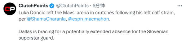 究竟东契奇的伤势如何?据名记Shams报道,东契奇明天将接受核磁共振检查,他将因小腿拉伤将缺席一段时间的比赛,今日赛后东契奇拄拐离开球馆。