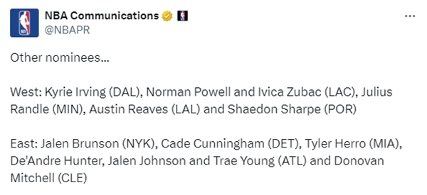 24直播网讯北京时间12月31日,NBA官方公布本赛季第10周东西部周最佳球员,76人球星马克西和雷霆球星亚历山大当选,两人都是场均30+当选,欧文、布伦森、里夫斯等人获提名。