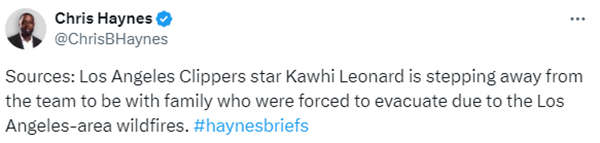 24直播网讯北京时间1月9日,据名记Chris Haynes报道,消息人士透露,快船球星莱昂纳德因个人原因暂时离队。据悉,小卡离队的原因是,他要陪伴因在南加州的山火而被迫疏散的家人们。