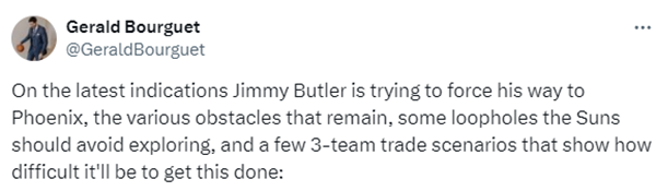 据太阳记者Gerald Bourguet报道,最新的迹象表明巴特勒正在试图强行加盟太阳,但交易仍旧存在很多障碍,热火对比尔不感兴趣,若促成交易,他们需要找到第三方接收比尔的大合同。