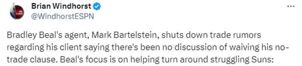 Bartelstein表示,比尔绝对不可能主动放弃合同中的交易否决权;若出现完美情况,比尔也不会排除放弃交易否决权的可能性,就像2023年被交易到太阳那样,不过他重申,目前比尔不会考虑这些。