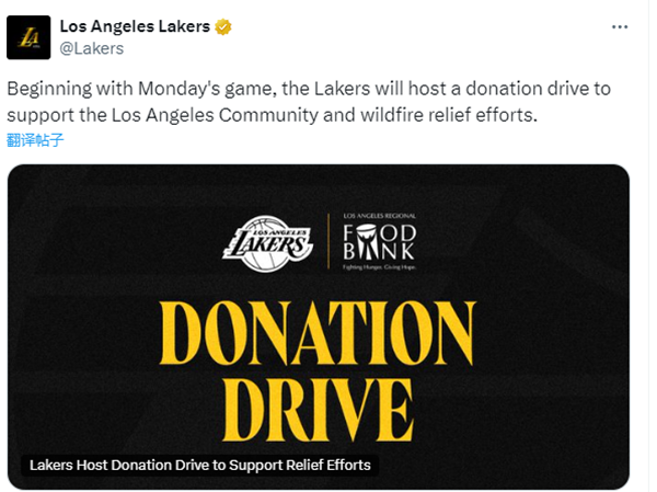 湖人官方已经宣布明天与马刺的比赛如期举行,赛前,湖人将举办一场捐款活动,以支持洛杉矶社区和南加州山火的救援工作。