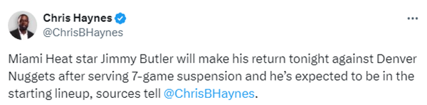 24直播网讯 北京时间1月18日,据名记Haynes报道,热火球星巴特勒在被球队禁赛7场后将于今日对阵掘金复出,预计将进入首发阵容;此前因多次对球队不利行为,热火将巴特勒停薪禁赛7场,目前他已经连续缺战了爵士、国王、勇士、爵士、开拓者、快船和湖人7场比赛。