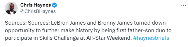 24直播网讯 北京时间1月24日,据名记Chris Haynes报道,詹姆斯和布朗尼收到了全明星周末技巧挑战赛的邀请,但他们拒绝了,他们拒绝了创造历史的机会;布朗尼还拒绝了与G联赛球员一同参加新星赛的邀请。