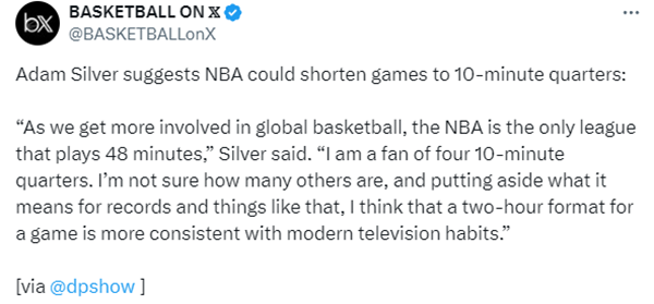 24直播网讯 北京时间1月30日,NBA总裁亚当-萧华公开表示,他支持NBA把每节比赛时间改为10分钟,两个小时的比赛时长更符合现代电视节目习惯。