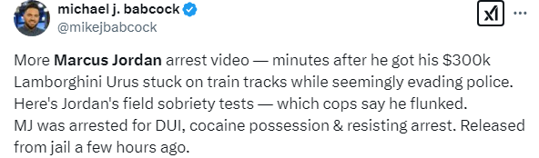 今日美媒曝光乔丹之子马库斯被逮捕的画面——马库斯把自己的豪车(价值30万美元的兰博基尼Urus)开到了铁轨上,副驾驶上坐着一位美女;警察过来并且让马库斯下车,之后警察问马库斯怎么了,马库斯表示他想回家却开错了路,结果自己的汽车困在了铁路上。