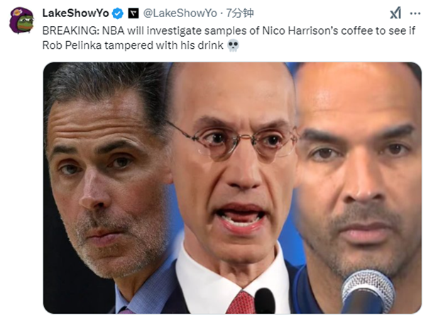 哈里森与佩林卡面对面谈判一幕曝光后引发热议,湖人媒体LakeShowYo晒照调侃:NBA将介入调查哈里森的咖啡的样本,看看佩林卡是否在咖啡中做了手脚;该媒体还表示:你认为谁付了咖啡钱?