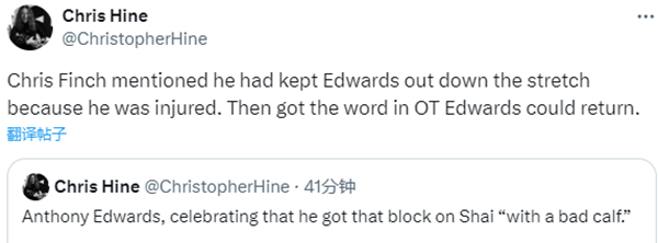 为何末节最后时刻换下爱德华兹以及加时换回华子,赛后芬奇透露,爱德华兹的腿在第四节感到不适,这也是他当时没有上场的原因。在比赛还剩大约两分钟时,他被告知爱德华兹已经可以上场了。于是,爱德华兹回到场上,并送出了比赛中最关键的一次封盖。