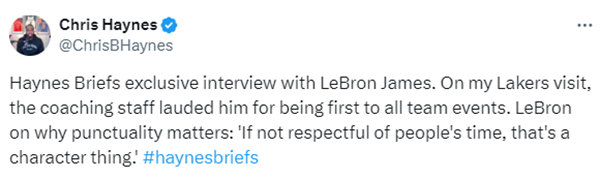 Haynes还表示,一位教练甚至说,他们从未在自己的职业生涯中见过任何球员有这么做过,更别提是超级球星了。如果他那样行事,其他球员也必须遵从。