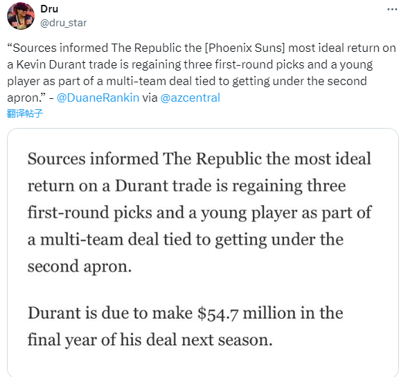 24直播网讯北京时间3月9日,太阳今夏真要交易杜兰特吗?据太阳随队记者Duane Rankin报道,太阳对杜兰特的最理想要价是三个首轮签和一个年轻球员,这将是一笔多方大交易。