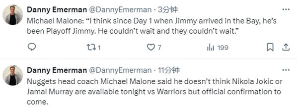 掘金对阵勇士赛前,马龙在接受采访时表示,他不认为约基奇和穆雷会出战勇士,稍后官方会确认;戈登很可能会出战。