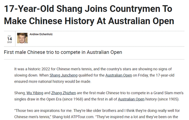 ATP官网以3人在墨尔本的合照,作为文章的开篇,标题则是《17岁的商竣程在澳网与同胞一同创造了中国的网球历史》。文章中写道:2022年对于中国男子网球来说,是历史性的一年,但在2023年他们没有放缓脚步的迹象。上周五,17岁的商竣程打入澳网正赛,创造了很多中国的历史记录。商竣程、吴易昺、张之臻同时参赛,成为公开年代以来第一次同时有3名中国男子网球选手参与大满贯单打正赛,同时也是澳网自从1905年成立以来的第一次。
