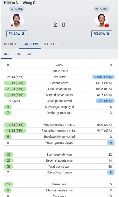 首盘比赛,王蔷开局便被连续两次破发,0-4落后。最终2-6先丢1盘。第2盘,王蔷状态依然梦游,0-3开局。尽管随后王蔷稍微提升状态,连追三局,但之后又连丢三局,并就此以3-6再输一盘。2盘比赛,王蔷仅得到5局,最终19天年内连续两次输给世界排名第185位的日比野菜绪,无缘女单八强。