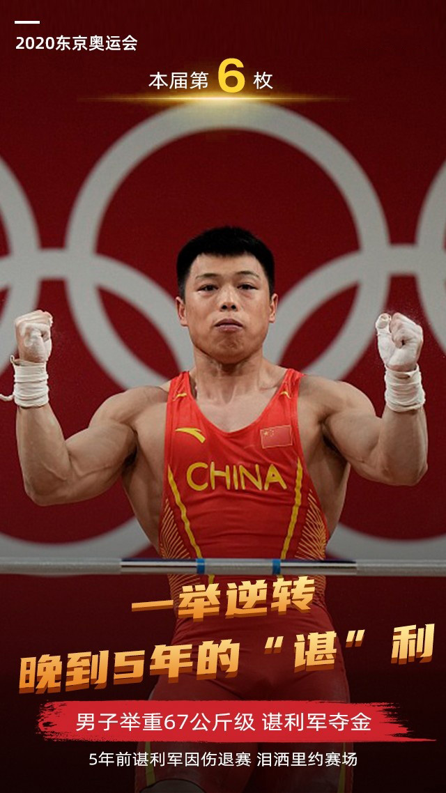 北京时间7月25日18点50分,2020东京奥运会男子举重67公斤级A组比赛在东京国际论坛大楼进行。谌利军在抓举表现糟糕的情况下,依靠挺举上演大逆转,挺举187公斤和总成绩332公斤均打破奥运纪录,上演惊天逆转夺冠,哥伦比亚选手莫斯奎拉以331公斤夺取银牌,意大利选手米尔科以322公斤获得铜牌。
