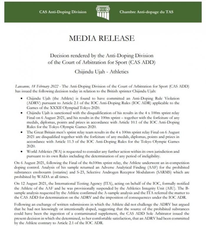 原因是英国运动员Chijindu Ujah被发现违反了反兴奋剂规则,他们原本在东京奥运会上取得了银牌!但因为该运动员违反了反兴奋剂规则英国队的成绩也会被取消,相关的奖牌(银牌)、积分和奖品会被没收。接下来相关组织还会推出禁赛处罚时长,可以说英国队真是尴尬了!