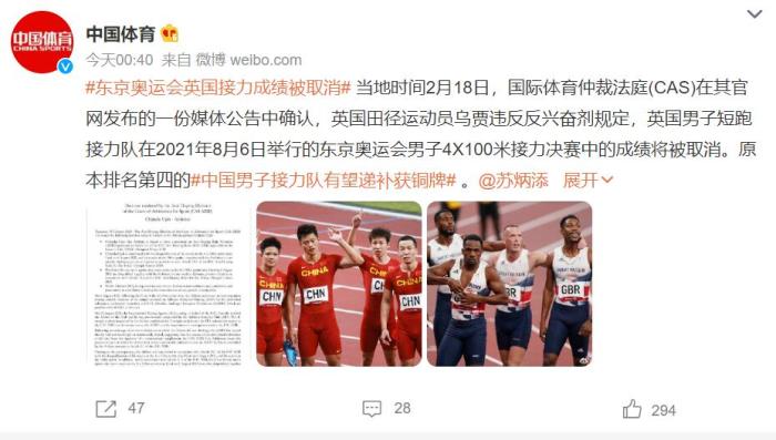 对于我们中国队来说则是巨大的喜讯,中国队苏炳添、谢震业、吴智强、汤星强以37秒79的成绩拿到4×100米接力的第四名,如今他们将递补拿到一块铜牌,创造历史最好成绩!当时拿到第四是很遗憾的,不少网友表示当时吴智强出现了失误,但苏炳添主动揽责是因为自己的速度没控制好导致交接棒有失误!