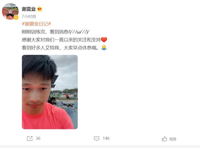 苏炳添截止到现在还没有谈及此事,他的队友谢震业率先在微博上发声了“刚刚训练完,看到消息感谢大家对我们一直以来的关注和支持看到好多人艾特我,大家早点休息哦。”