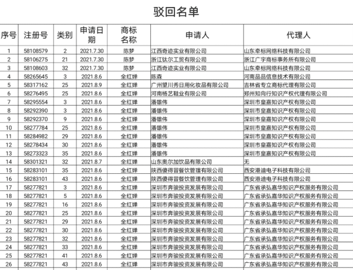 因此,对于这109个商标的申请予以快速驳回,还附上了一份名单。这份名单中,除了全红婵、陈梦、杨倩等人,还有杏哥(全红婵采访时的问句),杨大妞(杨倩网名),添神(苏炳添外号)等等。好在这些申请已经都被驳回。