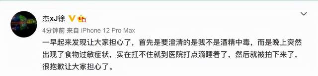 此前有人在互联网上发布了一条徐杰的视频,但是在视频的介绍当中,却写道徐杰是酒精中毒。视频中拍摄的人也是叫徐杰的名字,但是徐杰昏昏欲睡,十分像是一种醉酒的状态。而这段视频也是在互联网上流传。而徐杰本人也是在自己的社交媒体上进行了辟谣,他写道:“一早起来发现让大家担心了,首先需要澄清的是我没有酒精中毒,而是晚上出现了食物过敏的症状,实在扛不住就到医院打点滴睡着了,然后就被大家拍下来了,很抱歉让大家担心了。”