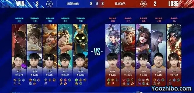 决胜局,济南RW侠蓝色方,拿到了宫本武藏+虞姬。重庆狼队红色方,拿到了镜+戈娅。开局济南RW侠下路强杀戈娅,拿下一血。9分钟,重庆狼队小胖强杀虞姬,一波零换二。决胜团,济南RW侠吕布一刀秒掉戈娅,一波一换四,直推水晶,拿下最终胜利。