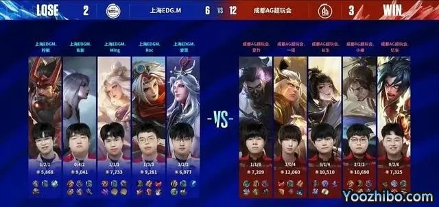 决胜局,上海EDGM蓝色方,拿到了镜+戈娅。成都AG超玩会红色方,拿到了宫本武藏+后羿。开局上海EDGM击杀宫本武藏,拿下一血。10分钟,成都AG超玩会击杀对面野辅,直推中路一塔,经济差拉开五千。决胜团,成都AG一波团灭上海EDGM,直推水晶,拿下最终胜利。