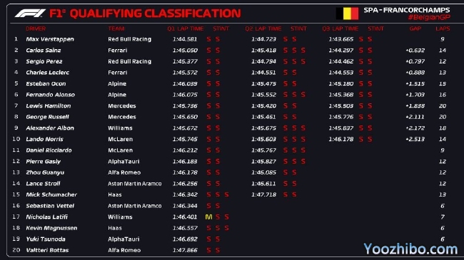 24直播网讯 2022年F1比利时大奖赛排位赛在斯帕赛道结束,红牛车队维斯塔潘以超过0.6秒的优势,连续两个赛季在斯帕拿到排位赛第一!法拉利车队塞恩斯第二,维斯塔潘的队友佩雷兹第三。但是由于维斯塔潘被罚后退发车,所以正赛中塞恩斯和佩雷兹将占据头排发车位。