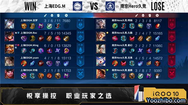 开局双方正常抢线。47秒野区南京Hero久竞击杀孙膑,拿下一血,打出2换1。2分41秒南京Hero久竞拿下暴君,上海EDG.M拿下主宰。5分41秒对抗路南京Hero久竞击杀曹操,摧毁敌方对抗路外塔。6分51秒南京Hero久竞摧毁敌方发育路外塔,上海EDG.M摧毁敌方中路外塔,击杀盾山,打出1换2,拿下主宰,摧毁敌方对抗路外塔,南京Hero久竞拿下暴君。8分53秒发育路上海EDG.M击杀铠,打出2换3。10分22秒野区上海EDG.M击杀铠,拿下暗影主宰,摧毁敌方对抗路二塔、发育路二塔。11分35秒上海EDG.M摧毁敌方发育路高地,击杀虞姬,曹操二连击破,打出0换4,摧毁水晶拿下比赛。