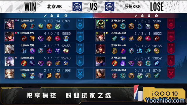 第一局双方常规开局。3分30秒苏州KSG对抗路击杀关羽拿下一血。4分01秒苏州KSG摧毁敌方对抗路外塔。5分16秒北京WB拿下暴君。5分35秒中路团苏州KSG打出0换2,随后摧毁敌方中路外塔。7分17秒北京WB摧毁敌方发育路外塔。7分50秒苏州KSG野区击杀铠。8分02秒苏州KSG摧毁敌方发育路二塔。8分37秒苏州KSG拿下先知主宰。9分30秒野区团苏州KSG击杀铠。10分27秒苏州KSG拿下暗影主宰。11分34秒苏州KSG摧毁敌方中路二塔。11分58秒苏州KSG摧毁敌方发育路高地塔。12分22秒苏州KSG拿下暗影暴君。13分02秒苏州KSG告破敌方三路外塔。13分25秒对抗路团苏州KSG打出0换5团灭对手。14分02秒苏州KSG摧毁敌方水晶拿下比赛。
