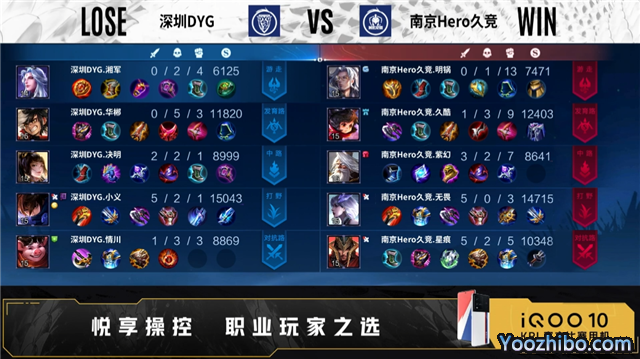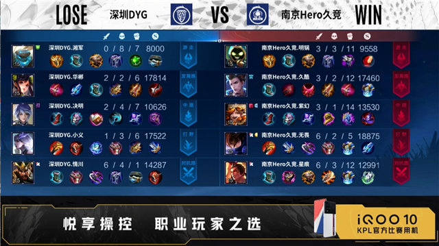 开局中路深圳DYG三人抢线。2分14秒南京Hero久竞拿下暴君,3分51秒拿下主宰。6分10秒南京Hero久竞摧毁敌方对抗路外塔,深圳DYG摧毁敌方发育路外塔。6分35秒中路南京Hero久竞击杀盾山,拿下一血,澜拿下暴君,摧毁敌方发育路外塔。8分24秒野区团战南京Hero久竞击杀盾山,打出1换2。9分19秒深圳DYG摧毁敌方对抗路外塔,南京Hero久竞拿下主宰。10分14秒南京Hero久竞拿下暗影暴君,中路团战南京Hero久竞击杀弈星,打出2换4。11分59秒中路团战深圳DYG关羽二连击破,南京Hero久竞澜二连击破,打出2换3,摧毁敌方中路外塔。13分09秒南京Hero久竞拿下暗影主宰,击杀盾山。14分03秒南京Hero久竞摧毁敌方发育路二塔,野区击杀镜,拿下暗影暴君。15分07秒南京Hero久竞摧毁敌方发育路高地,中路击杀盾山。16分38秒南京Hero久竞摧毁敌方对抗路二塔,拿下暗影主宰。18分14秒南京Hero久竞摧毁敌方对抗路外塔、中路二塔,双方打出1换1,南京Hero久竞拿下暗影暴君。19分26秒发育路南京Hero久竞击杀关羽。20分23秒南京Hero久竞拿下风暴龙王,深圳DYG弈星二连击破,关羽二连击破,打出2换5,摧毁敌方中路外塔、中路二塔。23分39秒野区团战南京Hero久竞击杀关羽,打出0换2,摧毁敌方中路高地,摧毁水晶拿下比赛。