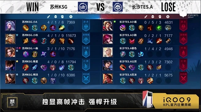 第四局开局长沙TES.A中路、对抗路换线。2分02秒苏州KSG对抗路击杀猪八戒拿下一血。3分11秒苏州KSG拿下暴君。3分17秒苏州KSG中路击杀李元芳。4分17秒长沙TES.A野区击杀蒙犽。5分29秒双方中路1换1。5分54秒苏州KSG摧毁敌方发育路外塔。6分28秒苏州KSG中路击杀上官婉儿。7分37秒苏州KSG拿下暴君。7分45秒中路团长沙TES.A击杀吕布。8分30秒河道团苏州KSG打出1换3,随后摧毁敌方中路外塔。9分47秒苏州KSG拿下主宰。10分11秒苏州KSG拿下暗影主宰,长沙TES.A镜像拿下暗影暴君。11分23秒苏州KSG中路击杀上官婉儿。11分49秒苏州KSG摧毁敌方对抗路二塔。12分13秒苏州KSG摧毁敌方中路二塔。13分26秒长沙TES.A中路击杀鬼谷子。14分02秒长沙TES.A拿下暗影主宰。14分39秒长沙TES.A野区击杀吕布。15分钟长沙TES.A摧毁敌方中路外塔。15分15秒长沙TES.A摧毁敌方发育路二塔。15分10秒苏州KSG拿下暗影暴君。18分10秒中路团苏州KSG打出1换2。18分43秒苏州KSG拿下暗影主宰。21分40秒中路团长沙TES.A打出0换3。22分11秒长沙TES.A摧毁敌方中路高地塔,随后击杀吕布。22分24秒苏州KSG摧毁敌方水晶拿下比赛。