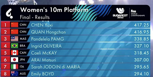 第五轮,全红婵5253B的动作,总分416.95分,排名第二,夺得银牌。陈芋汐最后一跳,5253B,总分417.25分,斩获金牌,恭喜。
