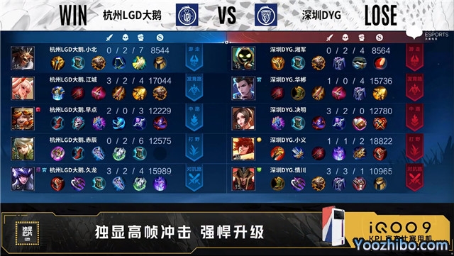 双方常规开局。1分02秒杭州LGD大鹅中路击杀牛魔拿到一血。2分34秒暴君处团战双方1换1。3分05秒深圳DYG中路上河道击杀镜。4分25秒深圳DYG中路击杀镜。5分06秒杭州LGD大鹅发育路击杀黄忠。5分48秒深圳DYG中路下河道击杀王昭君。6分14秒野区团战双方1换1。6分58秒深圳DYG抢到暴君。10分31秒深圳DYG拿下暗影主宰。10分44秒深圳DYG中路击杀盾山。11分20秒深圳DYG摧毁敌方中路外塔。12分58秒发育路团战深圳DYG击杀盾山。14分12秒中路团战深圳DYG打出1换2。14分34秒深圳DYG拿下暗影主宰。16分22秒暴君处团战深圳DYG打出1换3。17分01秒深圳DYG摧毁敌方发育路、中路高地塔。18分23秒深圳DYG拿下暗影主宰。19分25秒深圳DYG摧毁敌方水晶拿下比赛。