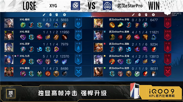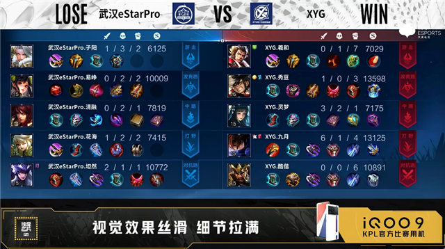 双方常规开局。1分59秒XYG对抗路击杀孙膑拿到一血。3分30秒武汉eStar拿下暴君。4分30秒武汉eStar野区击杀鲁班大师。5分34秒对抗路团战XYG打出1换2。6分25秒对抗路团战武汉eStar打出1换2。7分27秒XYG摧毁敌方发育路外塔。8分14秒武汉eStar摧毁敌方发育路二塔。8分40秒XYG野区击杀狄仁杰。10分52秒野区团战XYG打出1换2。11分53秒武汉eStar拿下暗影暴君并打出1换2。12分15秒武汉eStar摧毁敌方中路外塔。14分44秒XYG拿下暗影主宰。15分42秒武汉eStar拿下暗影暴君。16分41秒发育路团战武汉eStar打出0换3。16分48秒武汉eStar摧毁敌方水晶拿下比赛。