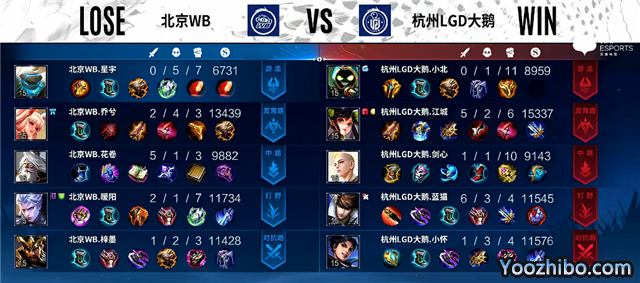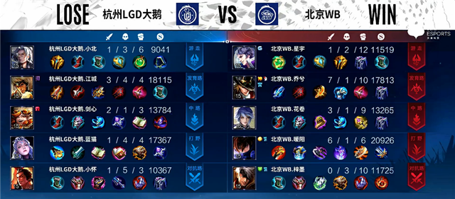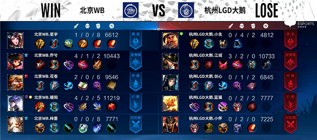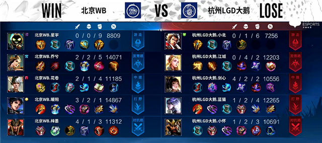 2分24秒镜拿下暴君。3分钟中路团战,镜拿下一血,杭州LGD大鹅打出0换2。4分30秒下路团战,双方1换1。6分50秒曜拿下暴君,嬴政推掉下路一塔。10分20秒杭州LGD大鹅上路一塔被破。10分30秒曜拿下暴君,镜拿下主宰。12分20秒野区团战,双方1换1。12分51秒蒙恬被击杀,镜拿下暴君。14分40秒曜拿下主宰。15分08秒曜拿下暴君。15分30秒虞姬推掉下路高地塔。16分15秒中路团战,北京WB打出1换3。18分20秒主宰团,北京WB团灭杭州LGD大鹅。18分59秒北京WB推掉水晶拿下本场比赛胜利。