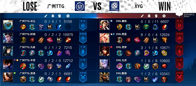 3分钟上路团战,猪八戒拿下一血,弈星拿下三杀,XYG打出1换3。4分钟橘右京拿下主宰。5分30秒下路团战,XYG打出1换2。7分钟上路团战,广州TTG打出0换4,鲁班七号推掉上路一塔。7分50秒鲁班七号推掉中路一塔。8分10秒镜拿下主宰。9分40秒橘右京拿下暴君。11分钟镜被击杀,橘右京拿下暴君。11分55秒鲁班七号拿下主宰。14分钟高地团战,广州TTG打出1换2,鲁班七号推掉中上2路高地塔。15分15秒镜拿下暴君,团战广州TTG打出2换4。16分钟广州TTG推掉水晶追回一分。