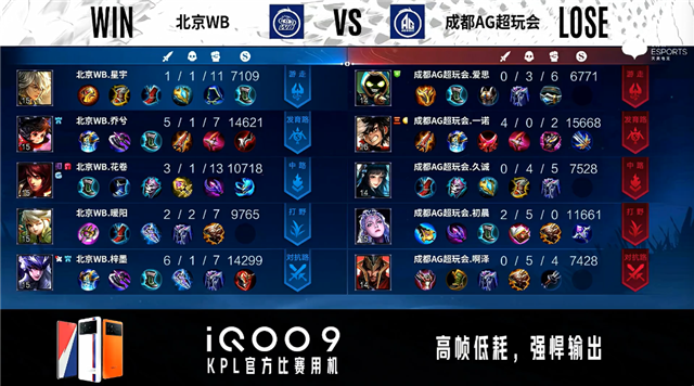 双方常规开局。1分57秒成都AG对抗路击杀不知火舞拿到一血。2分22秒成都AG拿下暴君。3分22秒野区团战成都AG野区击杀镜。4分09秒成都AG野区打出0换2。5分48秒北京WB摧毁敌方发育路二塔。6分46秒成都AG摧毁敌方中路外塔。8分50秒北京WB摧毁敌方中路外塔。9分30秒对抗路团战成都AG打出2换3,北京WB摧毁敌方对抗路二塔。11分59秒中路团战双方1换1。14分10秒北京WB抢到暗影主宰。14分57秒中路团战成都AG打出0换3。17分56秒成都AG拿下暗影主宰。18分05秒北京WB摧毁敌方发育路高地塔。18分18秒野区团战成都AG击杀镜。18分56秒成都AG摧毁敌方发育路二塔。19分05秒成都AG摧毁敌方中路二塔。19分36秒成都AG摧毁敌方对抗路二塔。19分52秒成都AG摧毁敌方中路高地塔。21分31秒成都AG龙王处打出0换2。22分03秒成都AG强点敌方水晶拿下比赛。