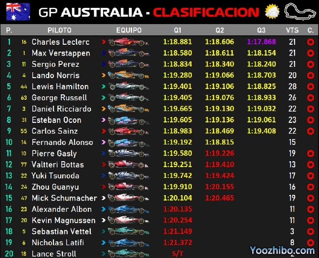 24直播网讯 2022年F1澳大利亚大奖赛排位赛4月9日下午在墨尔本赛道结束。法拉利车队勒克莱尔与红牛车队维斯塔潘Q3最后时刻先后刷新成绩,最终勒克莱尔做出1:17.868,拿到本赛季个人第二个杆位!维斯塔潘和佩雷兹分列二三位!