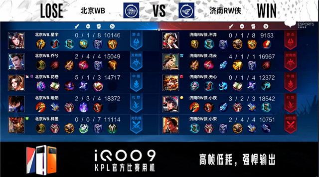 2分44秒,中路团,北京WB打出0换2,随后控下暴君。2分56秒,济南RW侠破掉北京WB上一塔。4分58秒,北京WB中路击杀赵云。5分40秒,北京WB破掉济南RW侠下一塔。7分50秒,北京WB拿下暴君。8分10秒,中路团,济南RW侠打出1换2。10分22秒,济南RW侠控下暗影暴君,随后北京WB镜像控下暗影主宰。11分钟,济南RW侠破掉北京WB下二塔。11分20秒,济南RW侠中路击杀关羽。13分01秒,济南RW侠破掉北京WB上二塔。14分30秒,济南RW侠公孙离野区击杀云樱。15分01秒,济南RW侠拿下暗影暴君,随后击杀盾山。15分35秒,济南RW侠中路击杀孙尚香,随后破掉北京WB中一塔。16分11秒,济南RW侠中路击杀云樱,随后破掉北京WB中二塔。16分28秒,济南RW侠破掉北京WB下路高地塔。16分42秒,济南RW侠控下暗影主宰。17分40秒,上路团,双方打出1换1。19分11秒,济南RW侠拿下暗影暴君。20分55秒,风暴龙王团,北京WB抢下风暴龙王,随后打出2换5团灭济南RW侠。21分50秒,北京WB破掉济南RW侠上路高地塔。23分12秒,中路团,北京WB打出0换2,随后破掉济南RW侠中二塔。23分55秒,济南RW侠高地击杀关羽。24分54秒,风暴龙王团,北京WB打出1换2,济南RW侠赵云抢下风暴龙王。27分43秒,野区团,济南RW侠打出1换4,随后下路一波摧毁水晶拿下本场比赛的胜利。