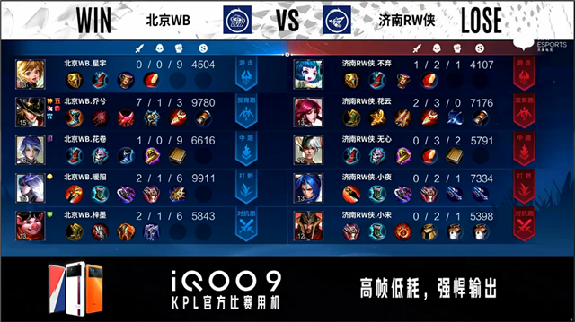 34秒,济南RW侠伽罗击杀马可波罗拿下一血,随后济南RW侠野区击杀镜。2分12秒,济南RW侠拿下暴君。2分42秒,中路团,北京WB打出0换2,随后北京WB下路击杀伽罗。4分30秒,北京WB下路越塔击杀伽罗和蔡文姬。4分54秒,济南RW侠控下先知主宰,随后北京WB破掉济南RW侠下一塔。6分21秒,北京WB拿下暴君。6分30秒,中路团,北京WB打出1换2。7分56秒,北京WB破掉济南RW侠上一塔。9分38秒,北京WB破掉济南RW侠下二塔。10分16秒,北京WB控下暗影主宰。10分42秒,野区团,北京WB团灭济南RW侠,马可波罗拿下五杀,随后北京WB上路一波推掉水晶扳回一局。