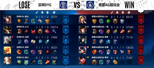 开局深圳DYG入侵野区拿下红Buff。2分20秒东皇太一抢下暴君。2分40秒下路团战,蒙犽拿下一血。3分34秒下路团战,双方1换1。4分11秒虞姬被击杀。4分37秒蒙犽推掉下路一塔。5分钟澜拿下主宰。6分钟野区团战,澜被击杀。7分钟赵云被击杀。7分24秒澜拿下暴君。8分42秒澜拿下主宰。10分钟暴君团,双方3换3。11分钟蒙犽推掉下路二塔。11分15秒蒙犽推掉中路一塔。12分10秒澜拿下暴君。13分钟上路团战,双方1换1。14分钟澜拿下主宰,东皇太一被击杀。15分55秒澜拿下暴君。17分钟嬴政推掉中路一塔。18分钟赵云拿下主宰。19分钟中路团战,成都AG超玩会打出0换2。20分钟成都AG超玩会推掉中下两路高地塔。21分35秒赵云拿下风暴龙王,团战成都AG超玩会打出0换2。22分18秒高地团战,成都AG超玩会打出0换4团灭深圳DYG。22分38秒成都AG超玩会推掉水晶追平比分。