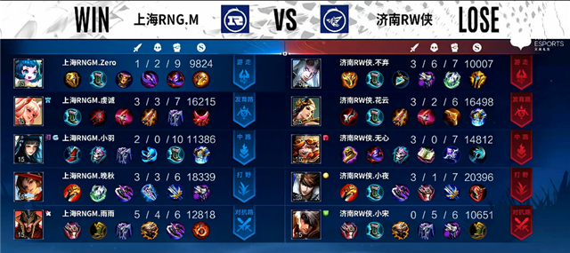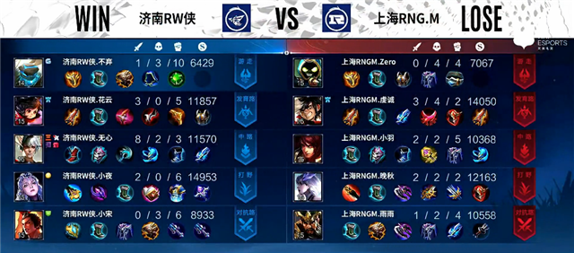 开局中路团战,济南RW侠打出1换2,嬴政拿下一血。1分20秒下路团战,济南RW侠打出0换2。3分钟李元芳拿下暴君。3分30秒镜拿下主宰。6分钟蒙犽推掉下路一塔。7分钟李元芳推掉下路一塔。7分12秒上路团战,济南RW侠打出0换2。8分05秒露娜拿下主宰。9分13秒河道团战,吕布被击杀。9分45秒镜拿下暴君。10分钟嬴政被击杀,周瑜推掉中路一塔。10分24秒露娜拿下暴君。11分40秒中路团战,盾山被击杀。12分50秒野区团战,吕布被击杀。14分钟镜拿下主宰。14分27秒镜拿下暴君。15分14秒嬴政推掉上路高地塔,团战济南RW侠打出1换2。16分钟李元芳推掉中路一塔。16分50秒中路团战,济南RW侠打出1换4。17分47秒济南RW侠推掉水晶拿下本场比赛胜利。