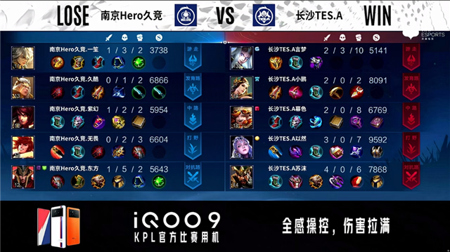 1分钟,上路团,双方1换1。2分09秒,南京Hero久竞控下暴君。2分20秒,长沙TES.A下路击杀大乔。4分14秒,南京Hero久竞控下先知主宰。7分14秒,南京Hero久竞控下暴君并破掉长沙TES.A下一塔,随后长沙TES.A控下南京Hero久竞上一塔。10分06秒,南京Hero久竞橘右京中路击杀嬴政。10分34秒,南京Hero久竞控下暗影主宰。10分50秒,南京Hero久竞破掉长沙TES.A中一塔。12分12秒,南京Hero久竞破掉长沙TES.A中一塔。13分钟,南京Hero久竞控下暗影暴君。13分45秒,下路团,南京Hero久竞打出2换3。14分52秒,南京Hero久竞控下暗影主宰。15分27秒,南京Hero久竞上路击杀张飞。15分43秒,南京Hero久竞破掉长沙TES.A上高地。16分10秒,南京Hero久竞破掉长沙TES.A中高地。17分06秒,南京Hero久竞控下暗影暴君。18分25秒,双方团,长沙TES.A打出1换2。19分07秒,长沙TES.A控下暗影主宰。20分40秒,双方团,长沙TES.A击杀虞姬后控下风暴龙王。21分30秒,长沙TES.A破掉南京Hero久竞中一塔。21分51秒,长沙TES.A破掉南京Hero久竞上二塔。23分13秒,南京Hero久竞强推掉长沙TES.A下高地。24分25秒,南京Hero久竞弈星抢到风暴龙王。25分26秒,高地团,长沙TES.A打出2换5团灭对手。26分16秒,长沙TES.A破掉南京Hero久竞下高地。28分10秒,长沙TES.A控下风暴龙王。30分40秒,长沙TES.A破掉南京Hero久竞上高地。31分40秒,双方团,南京Hero久竞打出2换3。33分08秒,长沙TES.A控下风暴龙王。34分47秒,长沙TES.A破掉南京Hero久竞中高地。34分49秒,长沙TES.A下路击杀橘右京。36分32秒,长沙TES.A控下风暴龙王。37分51秒,长沙TES.A边团边拆摧毁南京Hero久竞水晶先下一城。