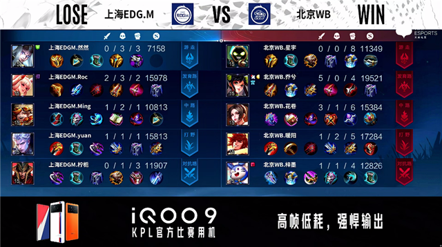 1分57秒,上海EDG.M芈月上路击杀蒙恬拿下一血。2分27秒,上海EDG.M控下先知主宰。2分47秒,北京WB镜击杀橘右京。4分40秒,上海EDG.M破掉北京WB下一塔。5分39秒,上海EDG.M击杀西施。6分50秒,上海EDG.M控下先知主宰。7分钟,上海EDG.M破掉北京WB下二塔,随后北京WB击杀芈月。8分钟,北京WB击杀老夫子。8分57秒,北京WB击杀芈月,随后控下暴君。10分12秒,北京WB击杀芈月后控下暗影主宰。10分50秒,北京WB击杀老夫子。11分37秒,北京WB控下暗影暴君。12分30秒,北京WB破掉上海EDG.M下二塔。13分18秒,上路团,北京WB打出1换3。13分53秒,北京WB破掉上海EDG.M上、中高地并击杀老夫子。14分26秒,北京WB控下暗影主宰。15分25秒,高地团,上海EDG.M反打打出0换2。16分53秒,中路团,北京WB打出0换2。18分27秒,北京WB控下暗影主宰。19分40秒,双方团,上海EDG.M打出1换2,北京WB主宰先锋摧毁上海EDG.M下高地。20分18秒,上海EDG.M控下风暴龙王。21分21秒,上海EDG.M破掉北京WB上二塔。22分20秒,上海EDG.M破掉北京WB中二塔。24分48秒,北京WB团战打出0换2。25分28秒,北京WB摧毁上海EDG.M水晶率先拿到赛点。