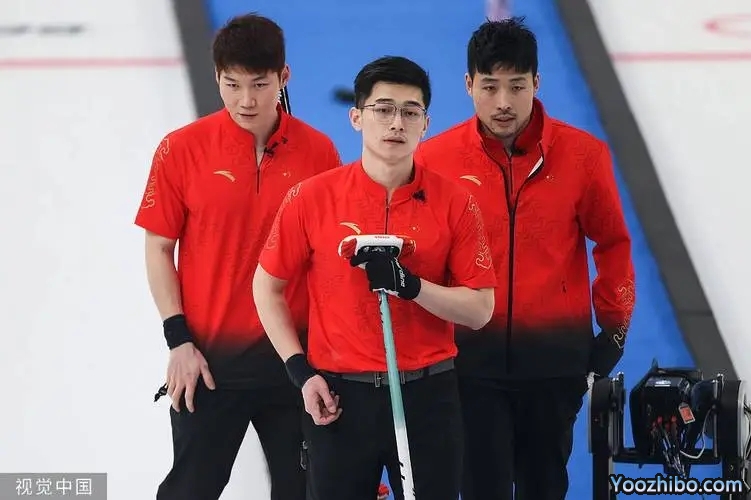 中国队手持红壶,出战的四名选手分别是许静韬、王智宇、邹强、马秀玥(按一垒到四垒的顺序)。
