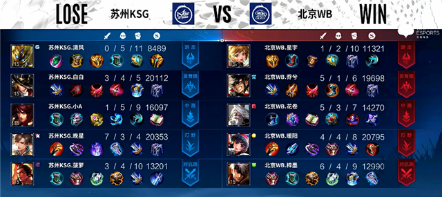 1分钟苏州KSG入侵野区,马超拿下一血,团战苏州KSG打出3换2。3分钟澜拿下暴君。4分钟中路团战,双方1换1。4分30秒杨玉环被击杀。6分钟阿古朵拿下主宰。6分32秒中路团战,苏州KSG打出1换2。7分30秒澜拿下暴君。8分10秒野区团战,苏州KSG打出0换3。9分钟李元芳推掉中路一塔。9分17秒野区团战,双方2换2。10分25秒澜拿下暴君。11分钟澜拿下主宰。14分30秒苏州KSG推掉中路高地塔,团战打出0换2。15分钟苏州KSG团灭北京WB推掉水晶追回一分。