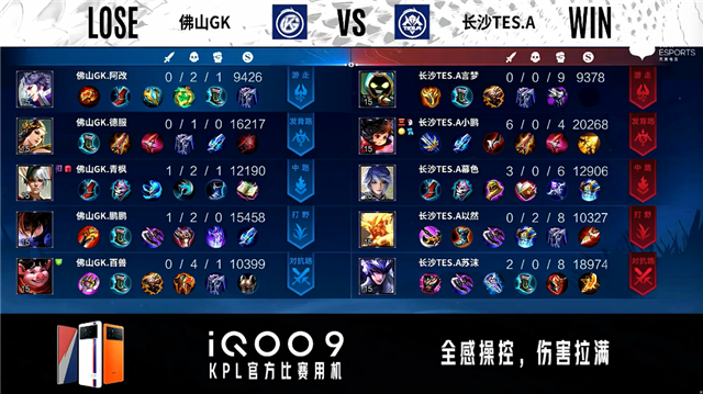 双方常规开局。1分35秒长沙TES.A野区击杀云缨拿到一血。1分42秒佛山GK中路击杀周瑜。2分13秒长沙TES.A中路击杀云缨。5分19秒长沙TES.A拿下主宰。5分29秒佛山GK摧毁敌方发育路外塔。6分58秒佛山GK发育路击杀露娜。8分15秒长沙TES.A中路击杀云缨。9分40秒长沙TES.A拿下主宰。10分27秒长沙TES.A发育路击杀蒙恬。11分28秒长沙TES.A对抗路击杀蒙恬。11分52秒长沙TES.A摧毁敌方对抗路二塔。12分17秒长沙TES.A摧毁敌方发育路二塔。12分50秒发育路团战双方1换1,长沙TES.A摧毁敌方发育路高地塔。13分59秒长沙TES.A拿下暗影暴君。14分54秒长沙TES.A拿下暗影主宰。17分08秒长沙TES.A对抗路打出0换5。17分22秒长沙TES.A摧毁敌方水晶拿下比赛。