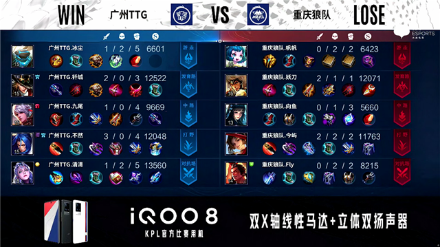 2分18秒,双方团,广州TTG打出1换2。5分17秒,重庆狼队控下暴君,随后团战双方1换1。5分52秒,重庆狼队破掉广州TTG下一塔。6分10秒,广州TTG澜上路单杀不知火舞。7分19秒,广州TTG下路打出0换2。9分48秒,广州TTG澜击杀阿古朵,随后破掉重庆狼队中一塔。10分21秒,广州TTG控下暗影暴君。11分27秒,广州TTG破掉重庆狼队下二塔。12分26秒,广州TTG控下暗影主宰。13分36秒,广州TTG破掉重庆狼队中、上二塔。14分钟,广州TTG击杀太乙真人。15分36秒,广州TTG上路团战打出0换3,澜拿下三杀,同时公孙离破掉重庆狼队下高地。15分48秒,广州TTG破掉重庆狼队水晶先下一城。