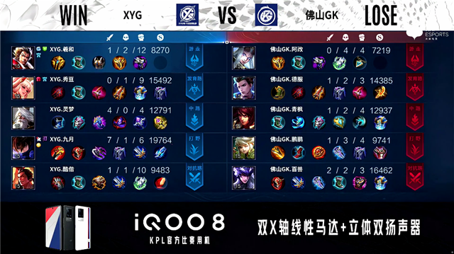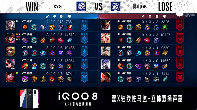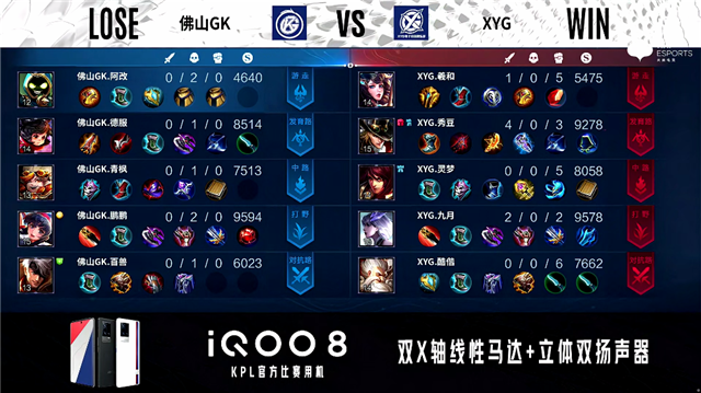 2分21秒,XYG李元芳击杀公孙离拿下一血。3分34秒,佛山GK控下暴君。3分57秒,XYG控下先知主宰。5分52秒,双方两处交火,XYG最终打出0换3。6分16秒,XYG破掉佛山GK上一塔。7分45秒,佛山GK控下暴君。10分钟,佛山GK击杀娜可露露。10分25秒,佛山GK控下暗影暴君,随后XYG控下暗影主宰。11分48秒,野区团,XYG最终打出1换4并破掉佛山GK上二塔。13分17秒,XYG中路击杀公孙离并破掉佛山GK中一塔。13分33秒,XYG破掉佛山GK上高地。14分34秒,XYG控下暗影主宰。16分14秒,XYG控下暗影暴君。16分40秒,XYG团战打出1换4并破掉佛山GK下、中高地。17分14秒,XYG击杀嬴政团灭对手后,摧毁佛山GK水晶赢下比赛。